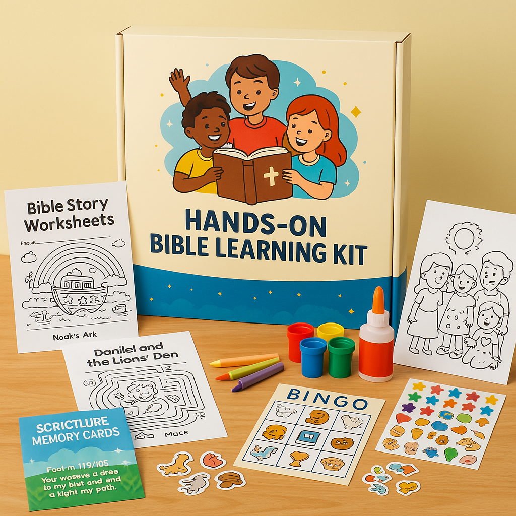 Make Bible learning exciting and meaningful with our Hands-On Bible Learning Kit! Designed for kids ages 3–10, this kit is filled with creative activities that bring Bible stories to life. Inside, you’ll find story worksheets, coloring pages, craft supplies, puzzles, games, and Scripture memory cards — everything you need to make faith lessons fun and memorable. Each activity encourages children to explore God’s Word through play, creativity, and hands-on discovery. Perfect for parents, Sunday school teachers, and homeschoolers, this kit makes it easy to teach important values like love, kindness, and forgiveness. The simple step-by-step guide helps you lead each lesson with confidence.